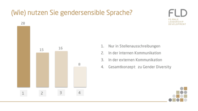 In einem Impulsvortrag für Personaler:innen 2021 erfragten wir bei den Teilnehmenden deren betriebliche Verwendung von gendersensibler Sprache. Der Großteil verwendet diese nur in Stellenanzeigen, nur knapp 20% der Befragten verwenden diese aufgrund oder im Rahmen eines Gesamtkonzepts zu Gender Diversity.