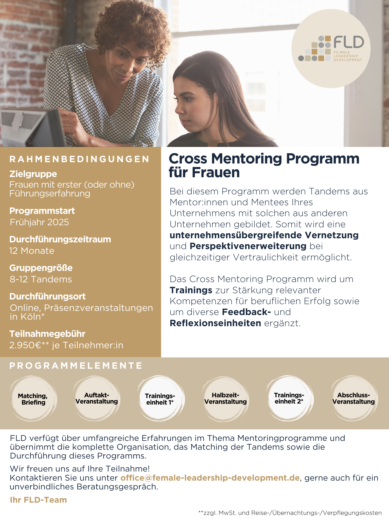 Im Frühjahr 2025 startet unser Cross Mentoring Programm, das Frauen gezielt in ihrer beruflichen Weiterentwicklung unterstützt. Die Bildung von Tandems mit Mentor:innen aus verschiedenen Unternehmen ermöglicht eine unternehmensübergreifende Vernetzung, die neue Perspektiven eröffnet.